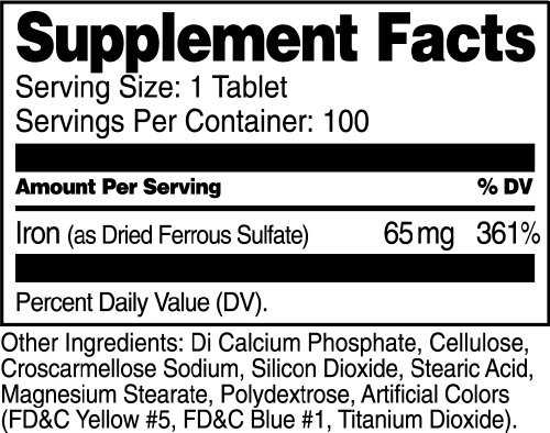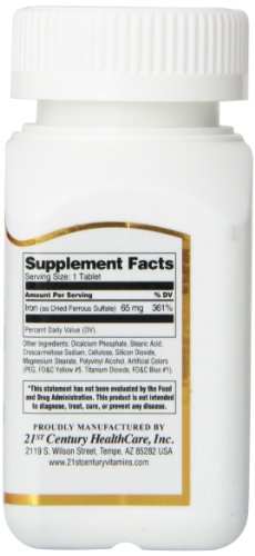 -. Binding : Health and Beauty -. Brand : 21st Century -. Label : 21st Century -. Manufacturer : 21st Century -. ProductGroup : Health and Beauty -. ProductTypeName : HEALTH_PERSONAL_CARE -. Publisher : 21st Century -. Studio : 21st Century -. Title : 21st Century Iron 65 Mg Ferrous Sulfate 325 Mg Tablets, 100 Count