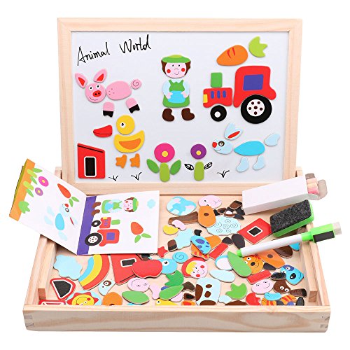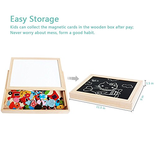 Let your child engage their imagination, have fun, learn and discover concepts and train their motor skills. ---Diwenhouse Wooden Magnetic Jigsaw Puzzle 100 Pieces Help Your Kid's Development This educational toy will encourage your child's recognition for patterns, hand-eye coordination and spatial intelligence, as they try to form animals, plants, figures and pictures either inspired by the examples or by what they have in mind. This magnetic puzzle set will also help the kids improve their aesthetic judgment, learning about the match of all shapes and colors and distinguish which element is more appropriate and beautiful. Multifunctional Wooden Magnetic Board Set 1. On the black chalkboard, children can write or draw with the supplied chalk. You can wipe the chalk marks with an eraser inside the box. 2. On the white magnetic side, children can play puzzle game with magnet and draw with the marker pen. A Great Activity While Traveling Portable and easy to store, it is an great traveling game for your little ones, keeping them busy and quiet for a while, having fun passing time while in the car. Note: Remember to remove the protective film from the white board before using it for the first time. What You Will Get: 1×wooden box 1×reversible double sided board 100×magnetic paper pieces 3×chalks 1×marker pen 1×idea book 1×blackboard eraser Friendly Customer Service We are always here to provide prompt and satisfying customer service if you have any idea about the product. 0 |