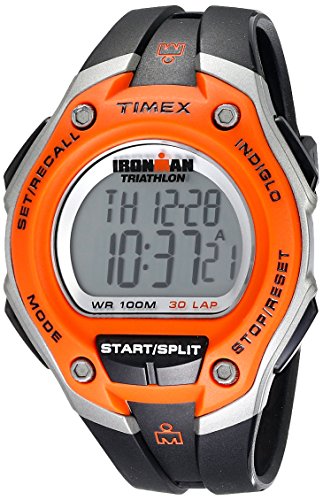Amazon.com The Timex Men's Sport Ironman Black and Orange Oversize 30 Lap Watch lives at the intersection of comfort and functionality. The lightweight 43.3mm bright orange and grey resin case and bezel hug the digital display, which boasts features such as 100-hour chronograph, 30-lap memory recall, 15 pre-set occasion reminders, 24-hour countdown timer and water resistance up to 330 feet (100m). The black resin band lends a comfortable fit and sporty look to the watch as it reaches out to the buckle clasp. 0