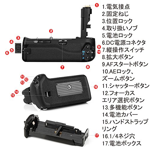 -. Feature : サイズ:150.1mm*84.9mm*116.7mm 重量:259.8g  適用電池:1本または2本LP-E6 / LP-E6N(バッケージで電池が含まれていません) 適用カメラ:canon 6d mark ii。 / PIXEL BG- E21 バッテリーグリップを取り付けるときは、電源コード穴ゴムカバーを開ける必要があります。 / バッテリーグリップを付けると、カメラは90度回転でも、水平位置にのようにシャッターを押すできる。縦撮りで安定性が強い、バランスを取れ、画像が安定化した。 / 垂直バッテリーグリップは望遠レンズのバランスを取るのに役立ちます。望遠レンズとマクロ撮影を使用する場合、効果的に手ぶれを防止します。 / 人間のS字型デザイン:力を節約 安全ロープ掛けリング:カメラが誤って落ちを防ぐ、また持ち運びが容易 1/4インチネジ穴:三脚に適用
