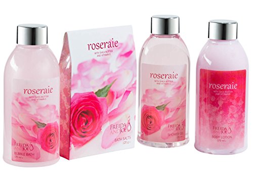 Contains :170ml shower gel ,170ml bubble bath ,170ml body lotion,120g bath salts, ribbon & tag About Fragrance: The classic pink rose, depicting Victorian are and decoration, symbolizes gratitude and admiration. These blushing beauties; sentimental for gentleness and affection, are always appreciated for romantic occasions. Silky rose pink petals, delicate and feminine will ensure a joyful and happy bath experience . Fragrance Notes Top: geranium, ozone, galbanum, cyclamen, rose, bergamot.Middle: muguet, ylang ylang, jasmine, violet, orange flower, fruity.Base: musk, cedar, amber. Treat that special person to the most luxuriously indulging bath experience. Each Freida&Joe Spa Gift Basket transports that fortunate recipient to some far-off intriguing and exotic location. As soothing, calm escapes from stress, the Spa Gift Sets moisturize and refresh the body, and revitalize the mind and spirit. Expressing your love, lifting someone's spirits, or just letting that special person know you are thinking about him or she has no designated day. The unique quality and distinctive fragrances of all Freida & Joe's products express perfectly and always that person is special to you.Feature