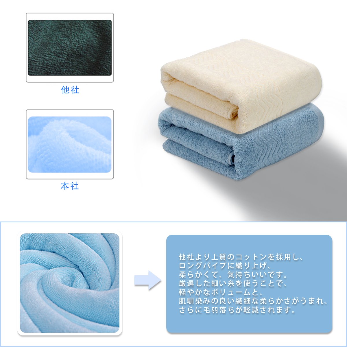 ④ Even though it is fluffy, it is more absorbing than thick towels, thin towels, gravitational feeling, easy fraying.