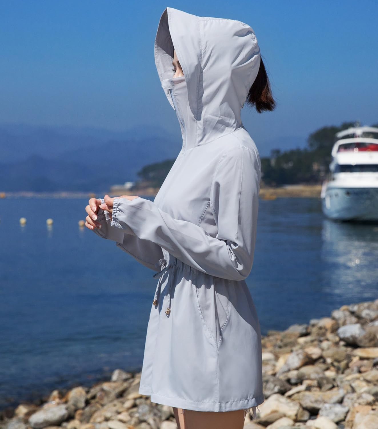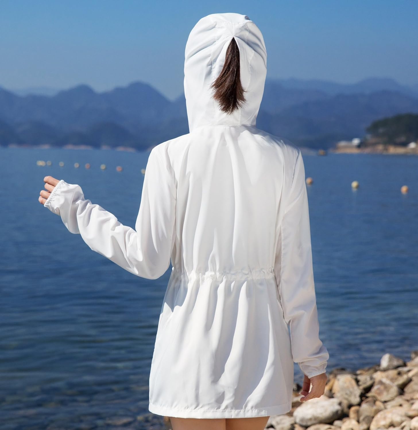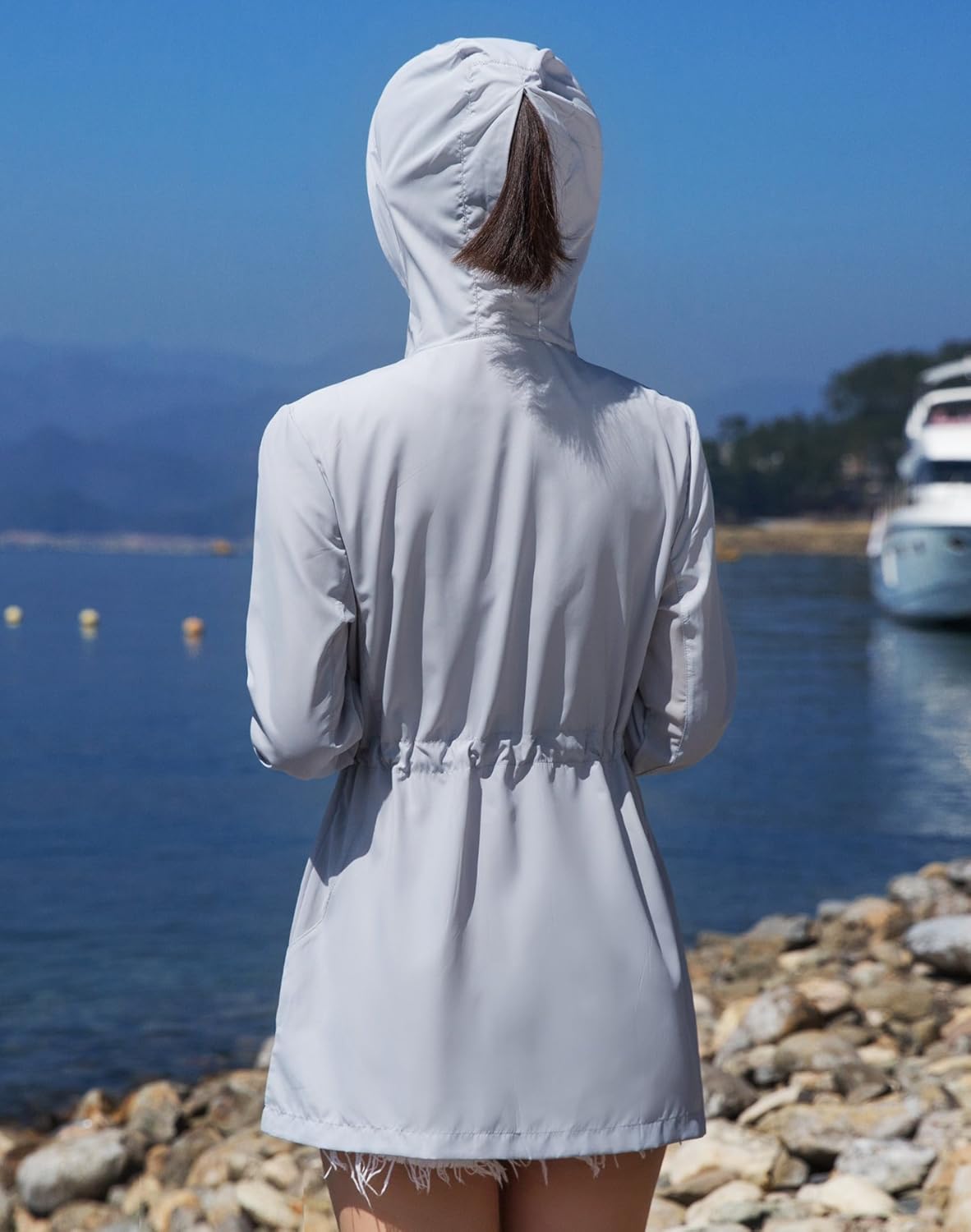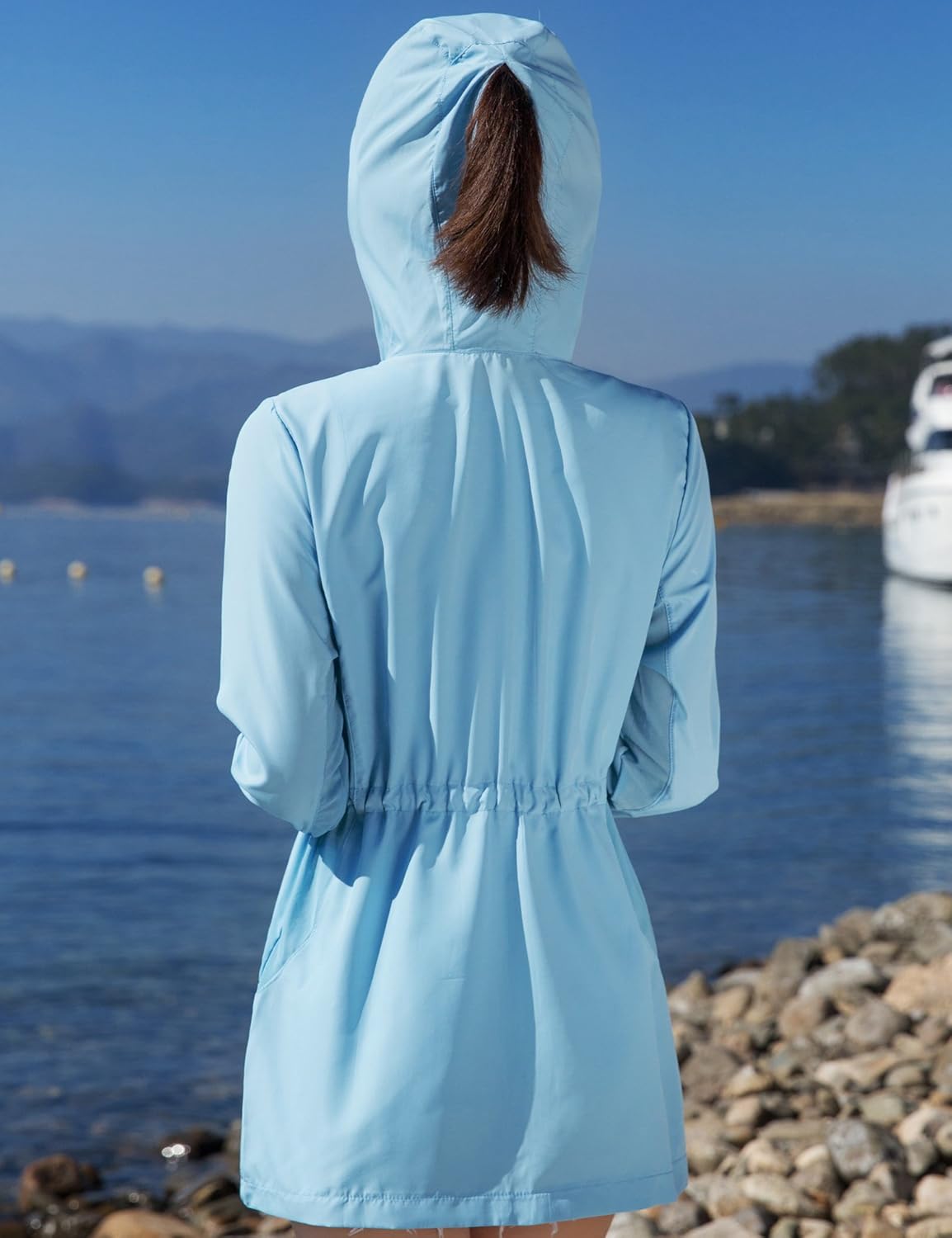 - フード付き(フードをかぶれば首や頭皮の日焼けもしっかりカバーしてくれます。フードの後ろにファスナーもついているので、ポニーテールを出せます。)