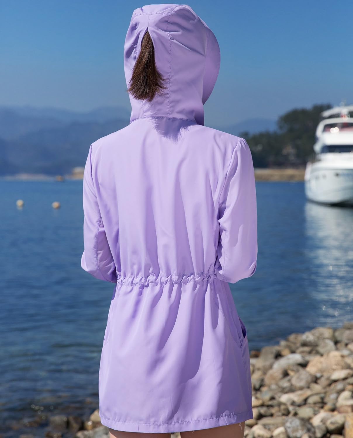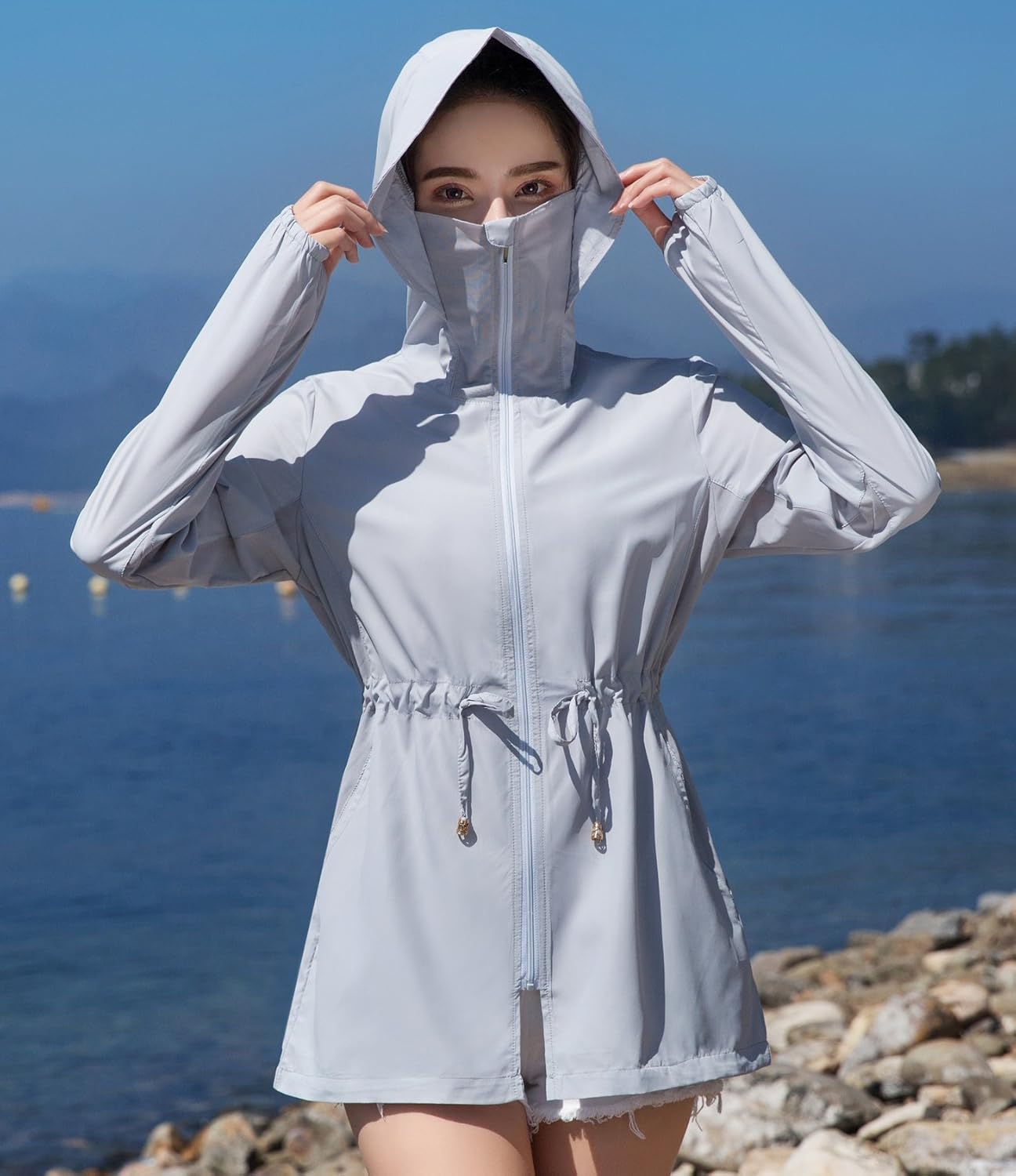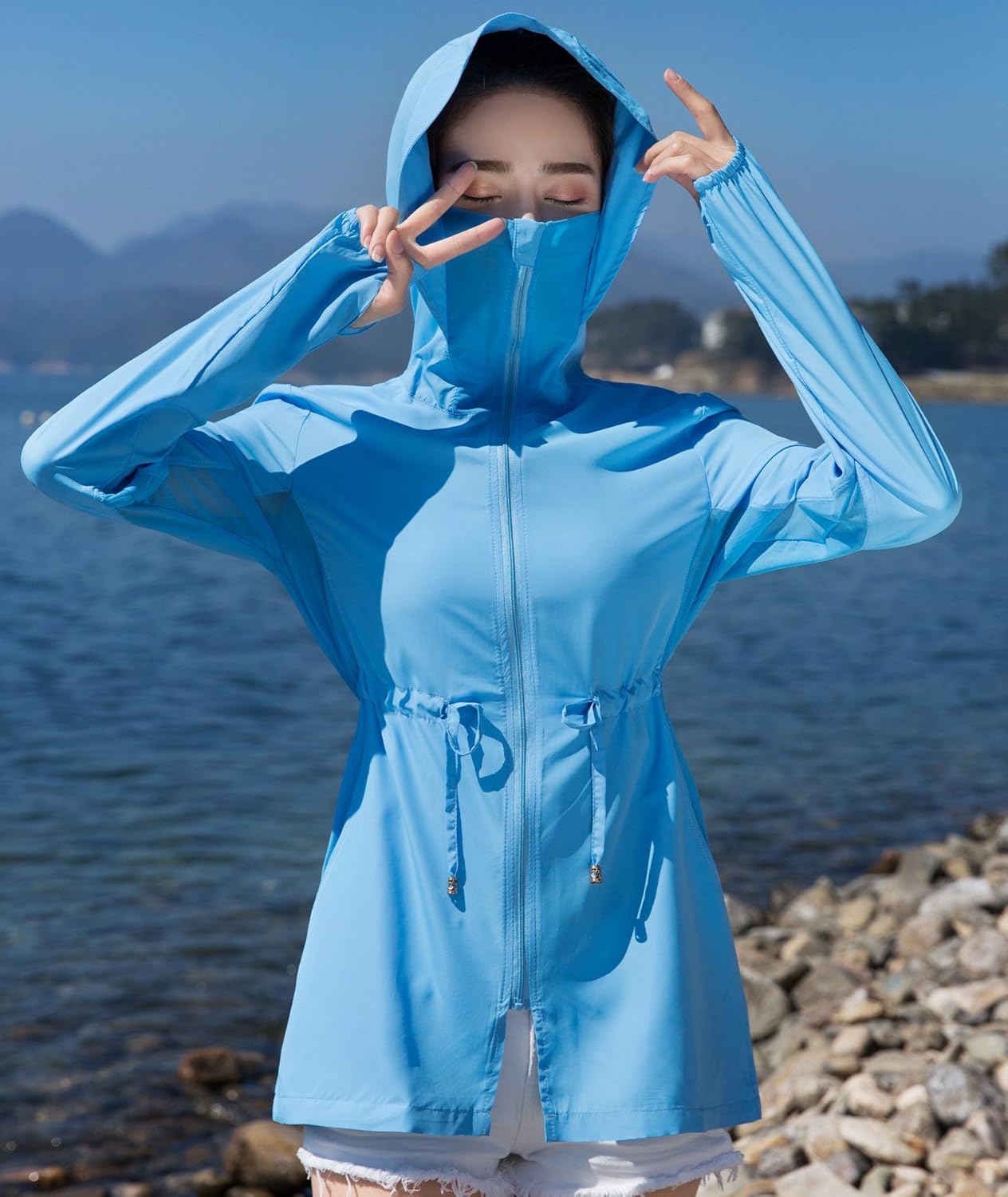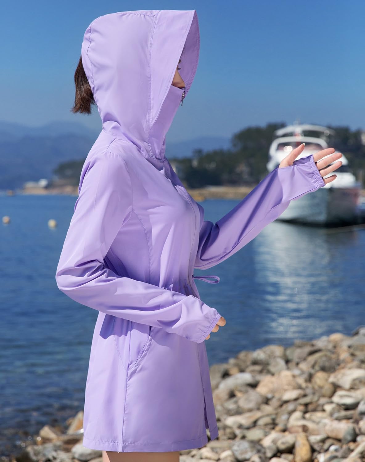 - フード付き(フードをかぶれば首や頭皮の日焼けもしっかりカバーしてくれます。フードの後ろにファスナーもついているので、ポニーテールを出せます。)