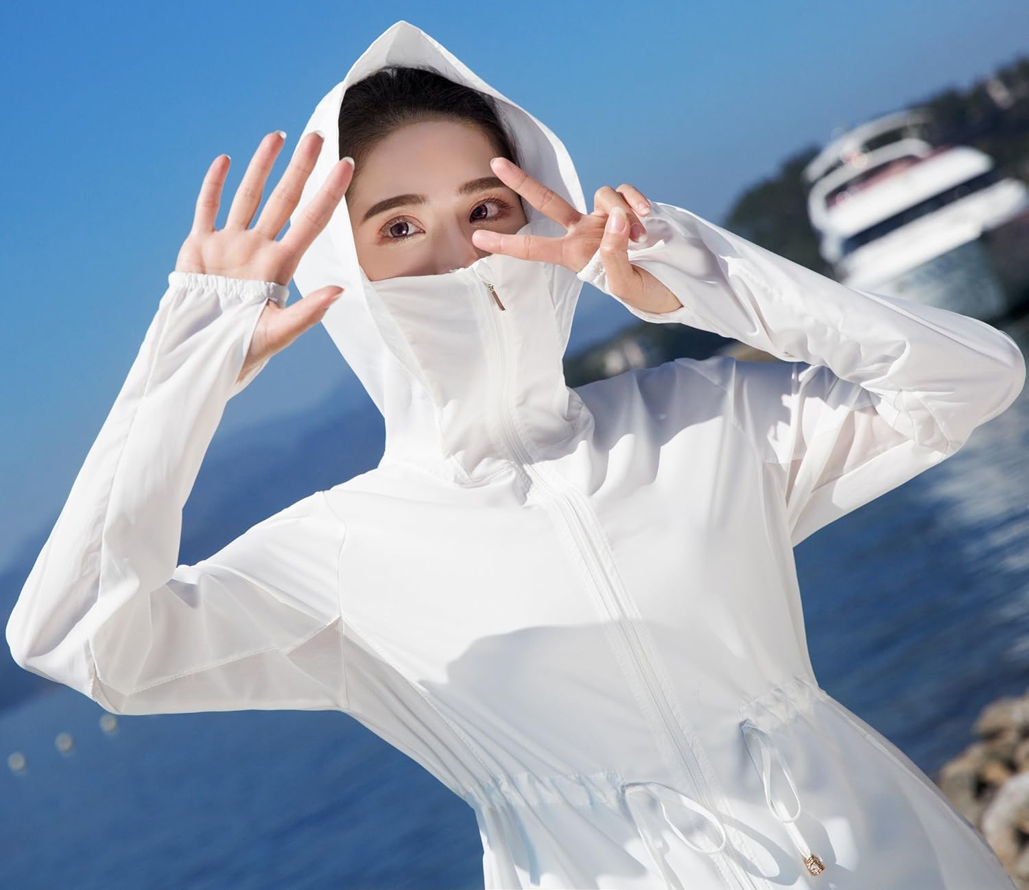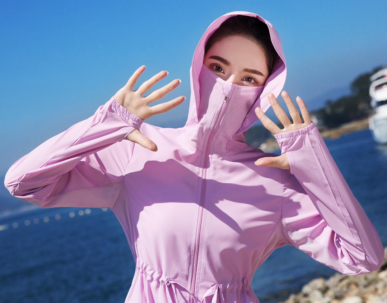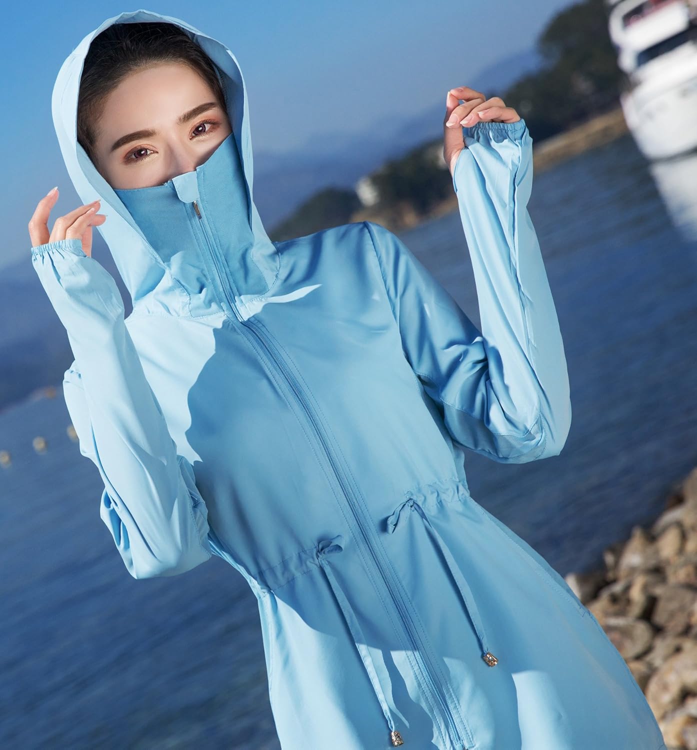 - フードとマスク仕業で、首から頭部までしっかりカバー、フードにファスナーも付いているので、ポニーテールを出せます。