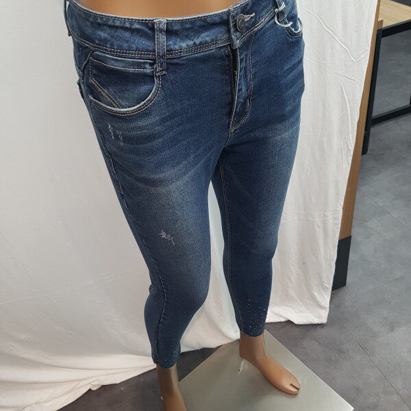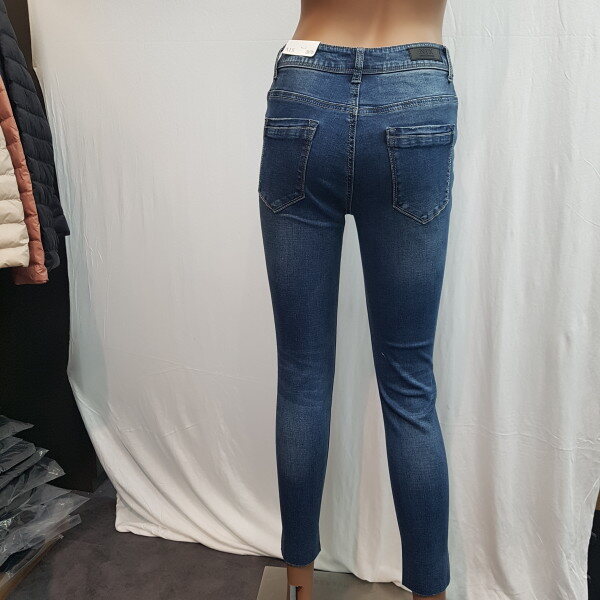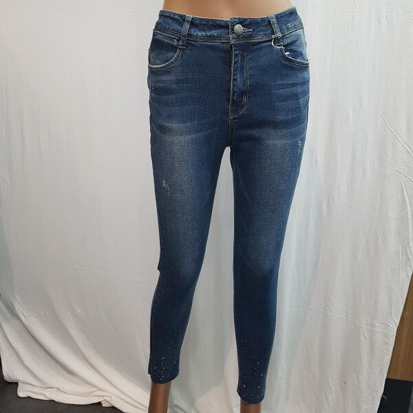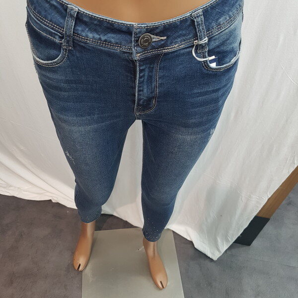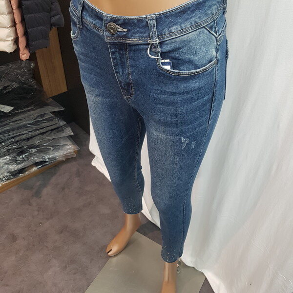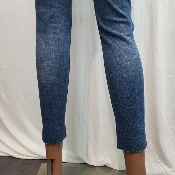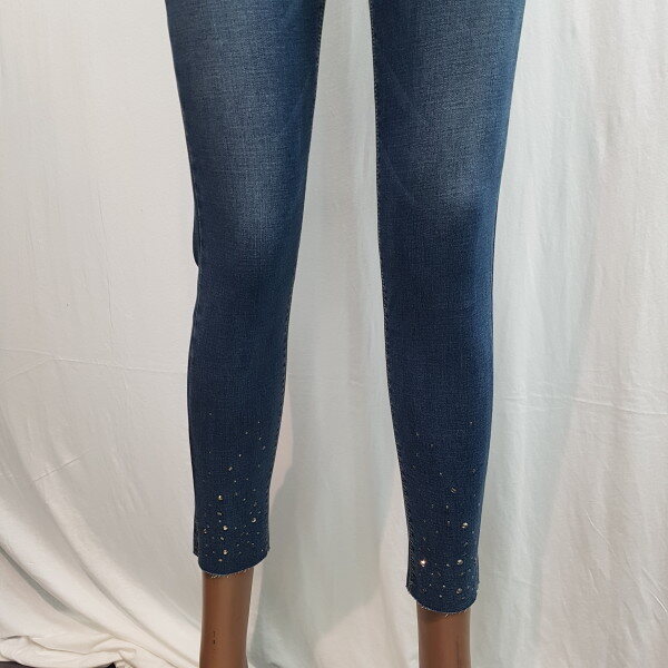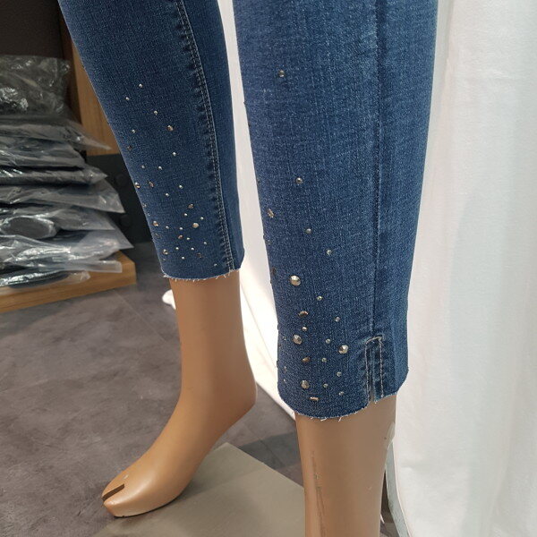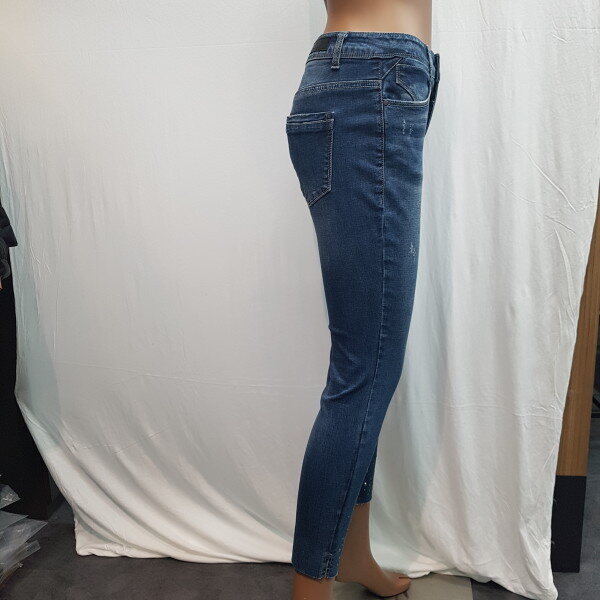 2018년 신상입니다. 바닥의 슬럽과 하얗게 올라오는 브러쉬, 밑단의 슬릿과 다양한 핫픽스의 디테일이 가미된 미디움 톤의 인디고 데님 제품입니다.