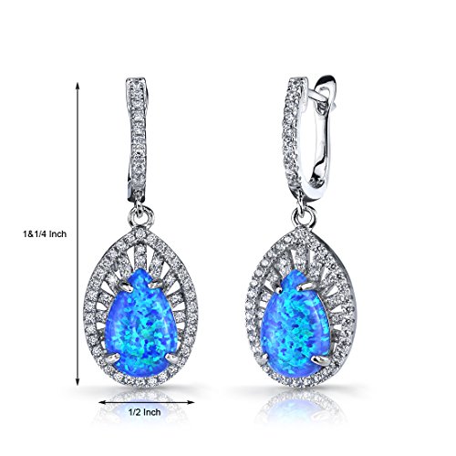 Center Stone(s): Created opal, pear shape, 3 Carats Total Weight, 12x8 mm. created opal exhibits Brilliant Sparkle and a Blue Iridescent hue. Side Stones: pieces cubic zirconia, 1.1 Carats Total Weight, white Color, VS1 VS2 Clarity. Earrings weighs 5.75 Grams and it is in 925 sterling silver. Features Exceptional Design, Styling and Craftsmanship. This makes a perfect gift for Mothers Day, Birthdays, Valentines Day, Graduation, Christmas or just about any other occasion. Includes Money Back Guarantee and Signature Gift Box. Style SE8594Feature