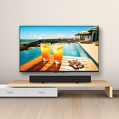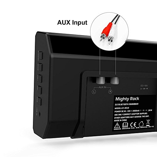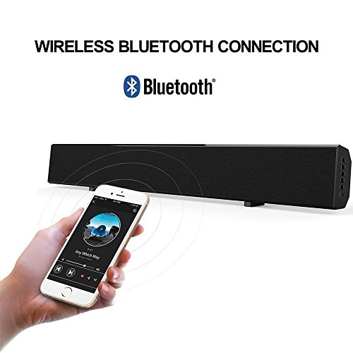 -. Feature : SUPERIOR SOUND QUALITY: 2.0 channel sound bar with remote control, sound bar features dual 15w speakers to deliver clear excellent stereo lound sound . you can enjoy movies, music, TV shows, news and gaming, it brings you an fantastic home theater surround sound experience / PORTABLE SIZE: Powerful design, great fit for TV, deliver immersive room-filling sound. It is convenient and beautiful if you put it under the television. / STYLISH & UNIQUE: Our portable bluetooth sound bar is designed for look as great as it sounds. The stylish and unique appearance will decorate your room more elegant and modern / MULTIPLE FEATURES: Soundbar Equipped with 3.5mm to RCA audio Cable, bluetooth can connect with cell phones, iPhone, IPad, iPod, HTC, Samsung, Tablets, play 3D surround audio from Laptops,PCs,mp3 player, let you enjoy a home Audio experience / WHAT WE OFFER: Bluetooth Soundbar; Remote Controller; Power Adapter; RCA Cable; 3.5mm audio Cable; User Manual, 18 months warranty, 24h customer service and email support