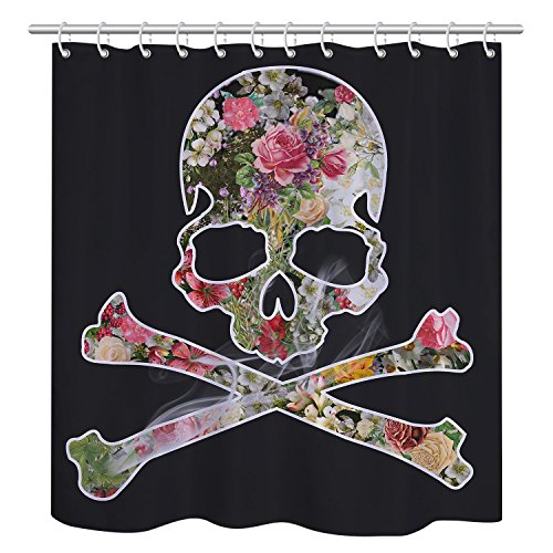 Skeleton Shower Curtain – Black Skull Head with Flowers Bath Curtain for Bathtub Funny Halloween Background Custom Bathroom Decor, Waterproof Mildew Resistant – 72 by 80 Inches, Polyester Fabric