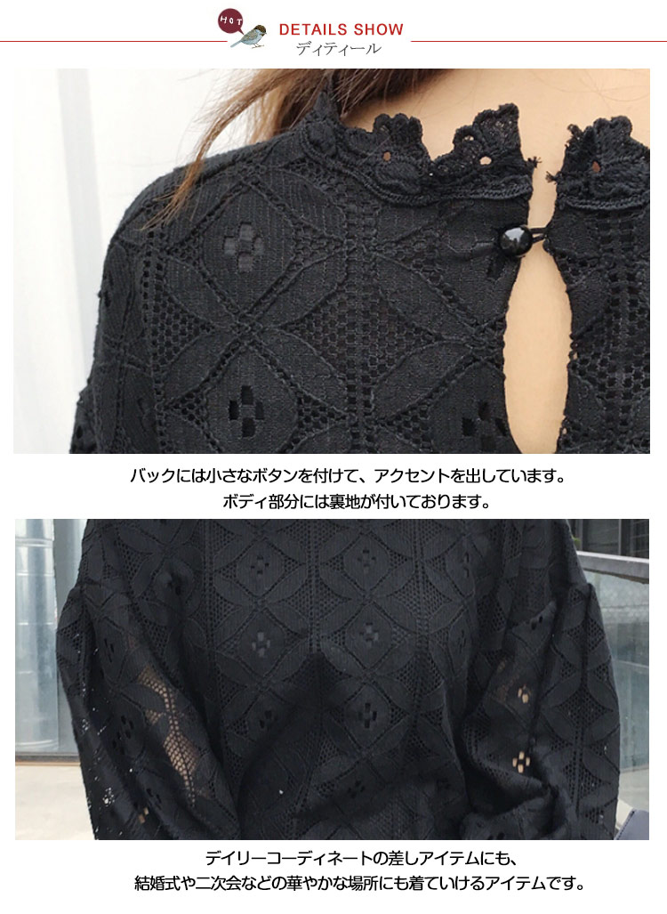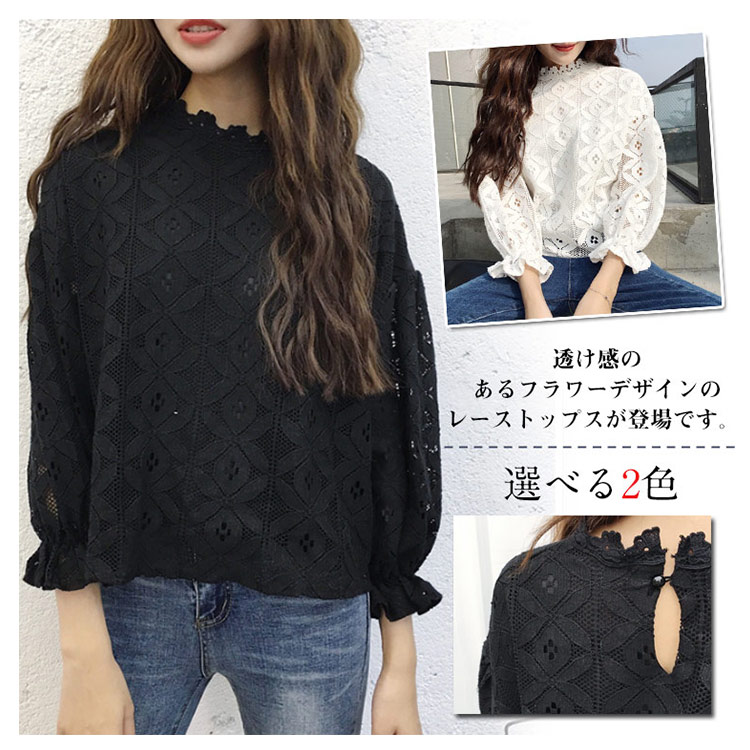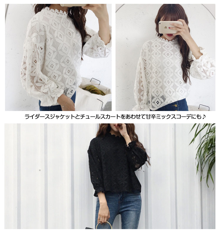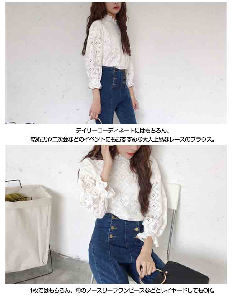 | 透け感のあるフラワーデザインのレーストップスが登場です。 袖に透け感を出して、エレガントでちょっぴりセクシーな雰囲気に仕上げました。 デイリーコーディネートにはもちろん、結婚式や二次会などのイベントにもおすすめな大人上品なレースのブラウス。1枚ではもちろん、旬のノースリーブワンピースなどとレイヤードしてもOK。ライダースジャケットとチュールスカートをあわせて甘辛ミックスコーデにも♪ | |