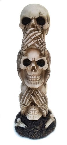 - This scary skeleton skull trio is acting out a familiar tale, placing their bony hands over eyes, ears and mouth to see, hear and speak no evil. - Because our polyresin products are individually hand-crafted works of art, colors may vary slightly from what is pictured here.