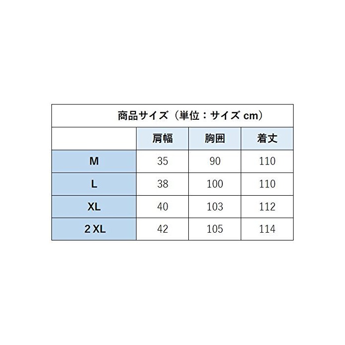사이즈:【M】 옷 길이:약110cm 가슴둘레:약90cm 어깨 폭:약35cm【L】 옷 길이:약110cm 가슴둘레:약100cm 어깨 폭:약38cm【XL】 옷 길이:약112cm 가슴둘레:약103cm 어깨 폭:약40cm【XXL】옷 길이:약114cm 가슴둘레:약105cm 어깨 폭:약42cm