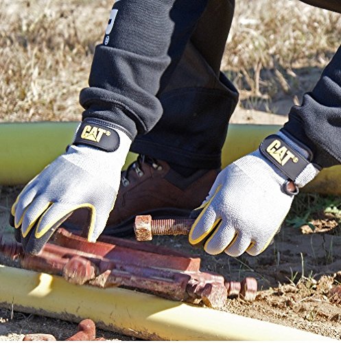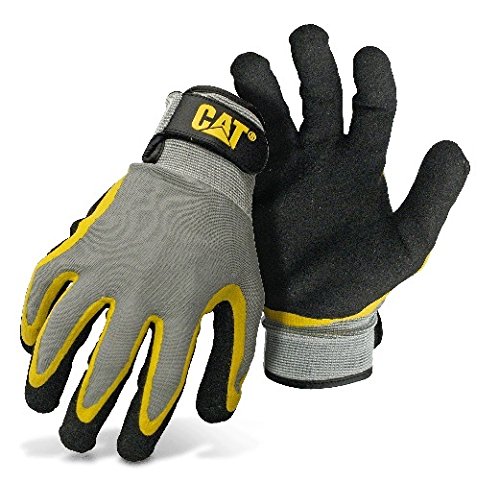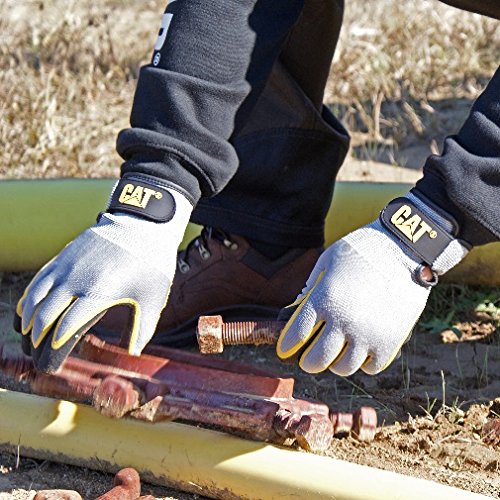 CAT CAT017415L Double Coated Textured Latex Palm with Black and Yellow Fingers with a Gray Polyester Back. Size Large