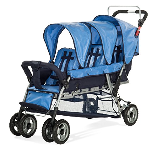 -. Feature : Dimensions: 56L x 32.5W x 47H in. / 3 seat stroller, each with a 5-point harness / Seats recline to accommodate infants / Easy to clean fabric / SafeBrake system engages when handle is released