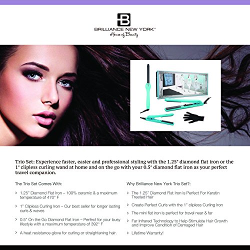 The secret to great hairstyles starts with great tools! Straight or Curl this 3 piece set offers you everything you will need to achieve any hairstyle you could want. The Trio Flat and Curling Irons Set from Brilliance New York includes the 1.25" Diamond and Ceramic flat Iron, the 1/2" Mini Diamond Flat Iron, and the 1" (25mm) Clipless Curling Iron. The Clipless Curling Iron is the answer to your lack of body and volume. Utilizing real diamonds and Far Infrared technology for constant even heat distribution and no damaging hot spots. This Curler uses Ionic technology which helps seal the cuticle, locking the moisture inside your hair shaft, and helping to protect your hair from humidity. Our Diamond Curling Iron offers heating temperatures up to 450ºº. Brilliance New York's professional 1.25-inch solid Ceramic flat iron is the ultimate iron for the salon or your stylist kit. This professional grade flat iron features pure, ultra smooth ceramic plates. Negative Ions allow for even heat distribution and to help seal the cuticle, locking the moisture inside your hair shaft, helping to protect your hair from humidity. Far infrared technology helps to support hair growth and helps to improve the condition of damaged hair. Nano silver technology Gem-IN Technology helps to prevent hair damage and dandruff. The Diamond and Pure Ceramic Flat Iron uses a floating plate design as well as universal voltage, which means it'll work anywhere in the world! The Professional model is suitable for all hair types and can reach a maximum temperature of 450º F (232º C). The 1/2" Diamond and Tourmaline Flat Iron is a super cute, ultra modern design allows you to combine sass with efficiency. Experience faster and easier styling and your perfect travel companion. Our Diamond iron offers heating temperatures up to 392º Fahrenheit. Whether you are at the gym, the salon, or on the go traveling, this professional 0.5? will help give you excellent results and requires almost no space.Feature