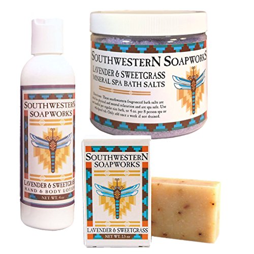 Southwestern Soapworks Lavender and Sweetgrass Mineral Spa Bath Salts, Body Lotion, and Handmade Glycerin Soap (3 Item Bundle)