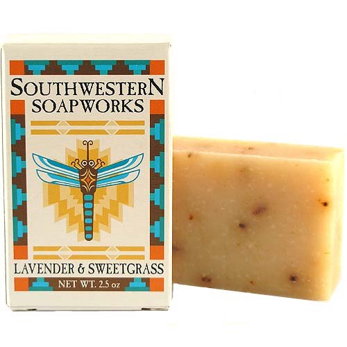 Lavender and Sweetgrass Soap contains ground lavender flower heads as well as ground sweetgrass. 2.5 oz bar in an attractive Southwest patterned box.