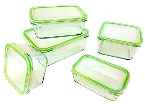 Kinetic 10 Piece (54oz,35oz,30oz,15oz,14oz) GoGreen Glassworks Oven Safe Glass Food Storage Container Set with Leak Proof Lids; (5 Containers and 5 Lids);01350