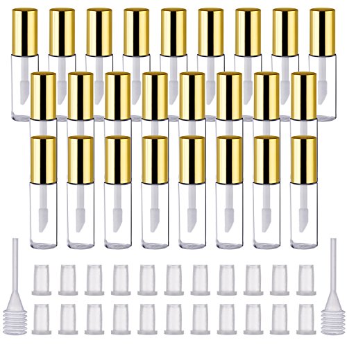 Package includes: 25 pack 1.2 ml empty lip gloss tubes with white brush and gold cap, 25 x rubber inserts, and 3 x transfer pipettes