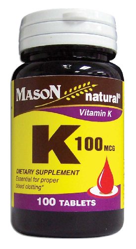 -. Binding : Health and Beauty -. Brand : Mason Vitamins -. Feature : Supports blood clotting and bone health / Essential for bone formation and repair / May help prevent osteoporosis / Promotes healthy liver funtions / Reduces the amount of calcium in the urine -. Label : Mason Vitamins -. LegalDisclaimer : These statements have not been evaluated by the Food and Drug Administration. This product is not intended to diagnose,treat,cure or prevent ant disease. This product has been manufactured and packaged in strict conformance with industry & government standards. Mason Natural®is a registered trademark and does not refer to any product claim. -. Manufacturer : Mason Vitamins -. MPN : 779-100 -. NumberOfItems : 4 -. PackageQuantity : 4 -. PartNumber : 779-100 -. ProductGroup : Health and Beauty -. ProductTypeName : HEALTH_PERSONAL_CARE -. Publisher : Mason Vitamins -. Studio : Mason Vitamins -. Title : Mason Vitamins Vitamin K 100 mcg Tablets, 100-Count Bottles (Pack of 4)