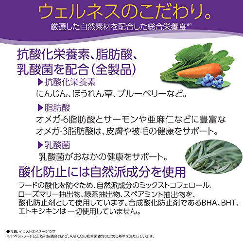 素材構成:粗たんぱく質28.0%以上 粗脂肪9.0%以上、11.0%以下 粗繊維6.0%以下 粗灰分7.0%以下 水分11.0%以下 カルシウム1.1%以上 リン0.9%以上 ビタミンE 400IU/kg以上 オメガ-6脂肪酸2.6%以上 オメガ-3脂肪酸0.6%以上 グルコサミン250mg/kg以上 コンドロイチン硫酸200mg/kg以上 ベータカロテン5mg/kg以上 L-カルニチン300mg/kg以上 タウリン0.09%以上 総乳酸菌※数43,000CFU/g以上 ※ラクトバチルス・プランタルム、エンテロコッカス・フェシウム、ラクトバチルス・カゼイ、ラクトバチルス・アシドフィラス