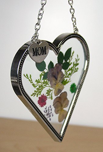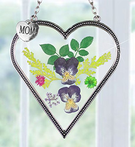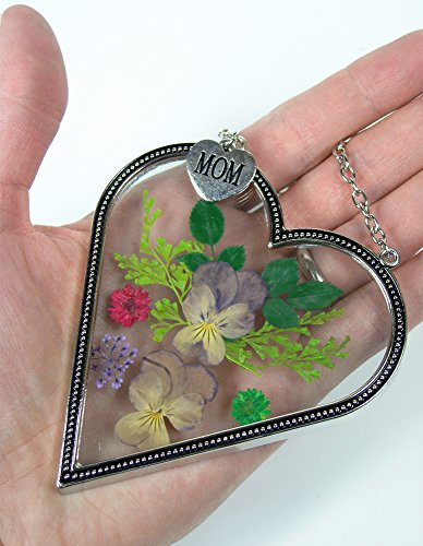 Mom Flower Sun Catcher - Mom Heart Shaped Sun Catcher Real Pressed Flowers and Silver Metal Hanging Charm