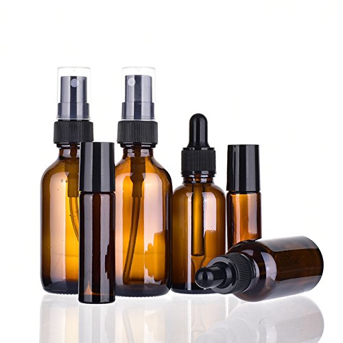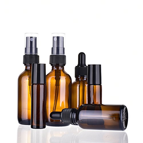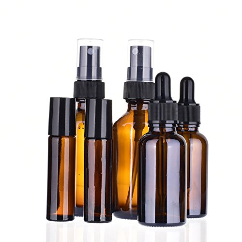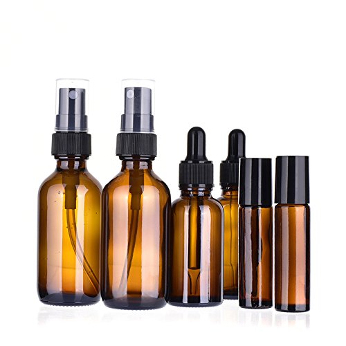 - High quality liquid container, empty glass spray bottles set. The package including two glass bottle spray 60 ml,two glass bottle with dropper 30ml, two roll-on bottles with roller balls 10ml.