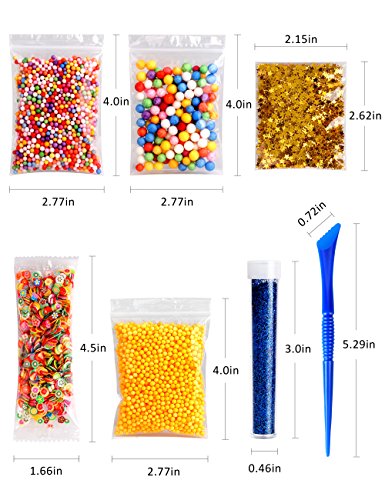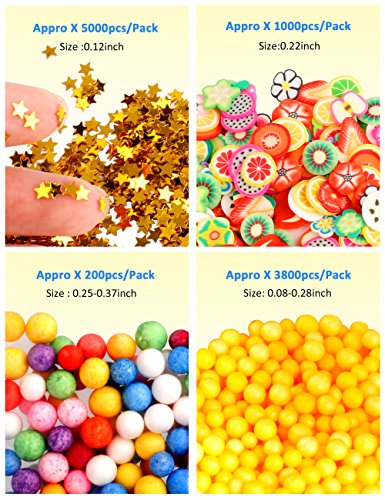 - 【BIGGEST SET SLIME SUPPLIES】Comes with 22 pack . Including 10 Pack solid different color foam beads , 4 pack colorful foam balls for slime, and 1000PCS fruit slices , 5000PCS confetti , 1 set of slime tools and 6 bottles glitter shake jars.