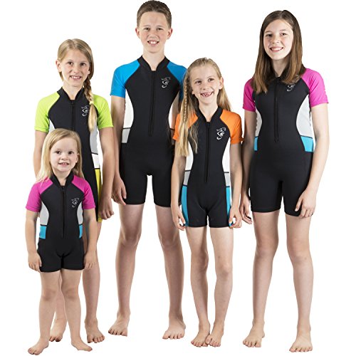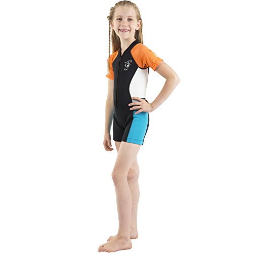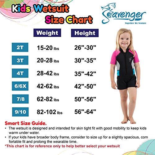From Seavenger own line of designs, these colorful, stylish and comfortable kids 2mm swim shorty, keep kids comfy and warm in the water, great shorty for fun time every time in water. UV Proof 50+ for maximum protection to shield them from harmful UV rays. It is constructed with great care to protect kids from cool or cold water and fun happy color combos that are just what kids would want. Tightly constructed flat-lock stitching plus durable front zip with inner layer panel for better seal and easy to put on & take off. Smooth and soft neck rim to ensure comfort, smooth and flat-lock stitch in thigh rim minimized discomfort. Colorful and stretchable shoulder/arm sleeves for fun, extra mobility and visibility. The suit also features super-stretch side panels for added flexibility and maneuverability. The parents will not only appreciate the budget-friendly price tag, but most importantly, a shorty that offers great protection for their kids under the sun and in the water. 4 color-combo for each size to choose from. The suit is backed by a one-year limited warranty. Material: Front/Back/Side panel, Neoprene 90%, Polyester 10%. Sleeves, Nylon 83%, Spandex 17%. High Quality Made in Taiwan