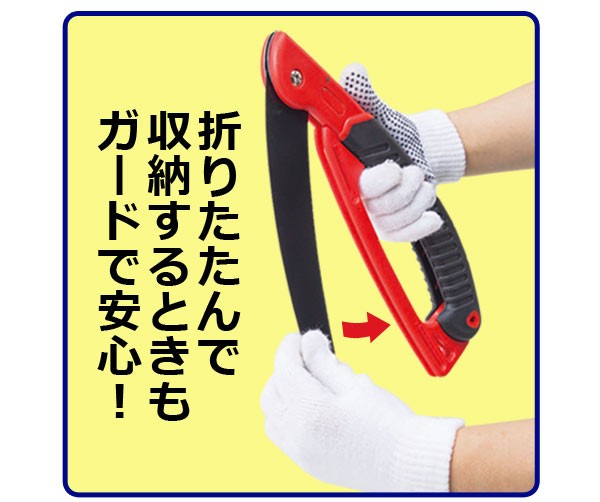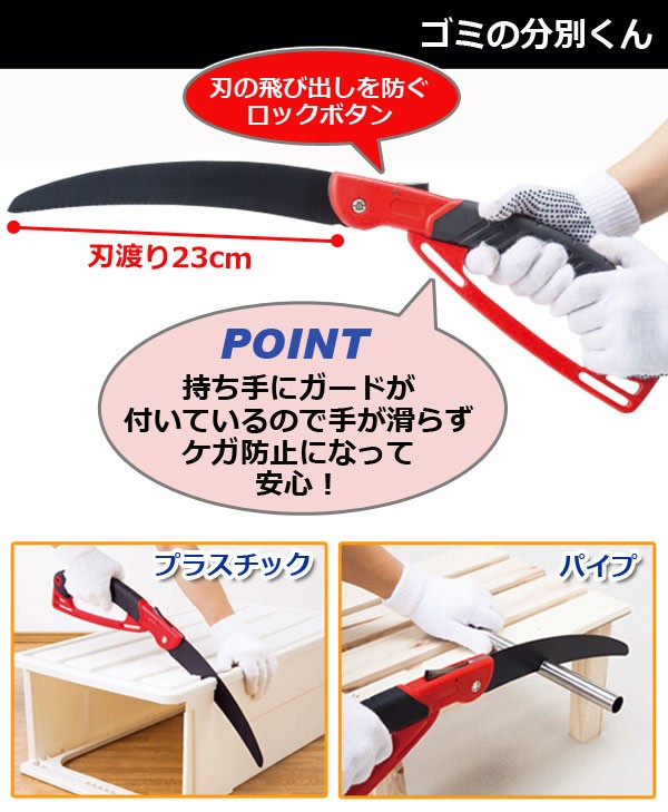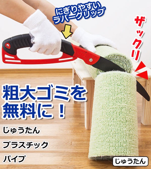 | じゅうたん・プラスチック・パイプなど粗大ゴミでしか出せないものを解体して普通ゴミにできるゴミの分別くん!ゴミ代を節約できて経済的です。持ち手は握りやすいラバーグリップで女性の方でも使いやすい!しかもガードが付いているので手が滑らずケガ防止になって安心!刃はおりたたんで収納できてコンパクトに!刃の飛び出しを防ぐロックボタンも付いているので安心・安全に使用できます。粗大ゴミ/折りたたみ/分別/経済的/のこぎり/刃/ガード/じゅうたん/プラスチック/パイプ/収納 |