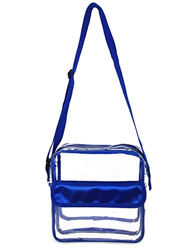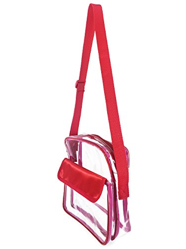 Stadium Compliant Clear Purse Easily Converts to Clear Cross Body Bag or Clear Satchel This is a clear cross-body bag with a long adjustable strap that makes it a multifunctional accessory. At its longest adjustment the clear bag strap easily sits over the shoulder while the clear bag itself rests comfortably on your hip. At the shortest adjustment the strap becomes a double handle allowing you to carry it as a clear handbag.
