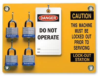 -. Title : Individual Lockout Station Kit - Each station includes 4 blue bumper padlocks and 25 DO, 12" x 9"
