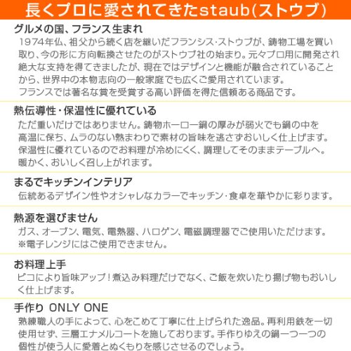 미식에 평판의 높은 지역에서,설립 된STAUB(스타우브)회사는,1974년에 최초의코코트를 개발한 이래완벽의 경지에 도달하는 것을 목표로 발자취 계속해라 있습니다. 예전부터 전해지는 전통이나 기술이라고 최선단의 과학기술을 구사하고, 고급 키친 웨어를디자인하고, 하나 하나 정중하게 수작업 되어 있습니다. 또한 품질로도 구애받아 모든 주물 법랑 제품을 프랑스에서 만들고 있습니다.전세계의 유명쉐프달도 애용한 키친 웨어 를 꼭 가정으로도.