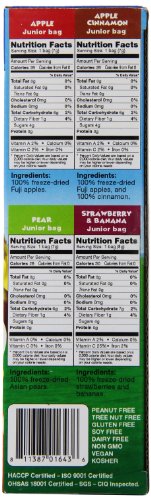-. Feature : Five 1.27 ounce packages per case, 2 Apple, 1 Apple Cinnamon, 1 Pear, 1 Strawberry Banana / 100% Freeze Fried Apples, Pears, Strawberries, and Bananas / 1 fruit serving per bag / Non-GMO/Vegan/Kosher/Gluten Free/Peanut and Tree Nut Free / 100% Fruit, No additives, preservatives, dyes, or added sugars