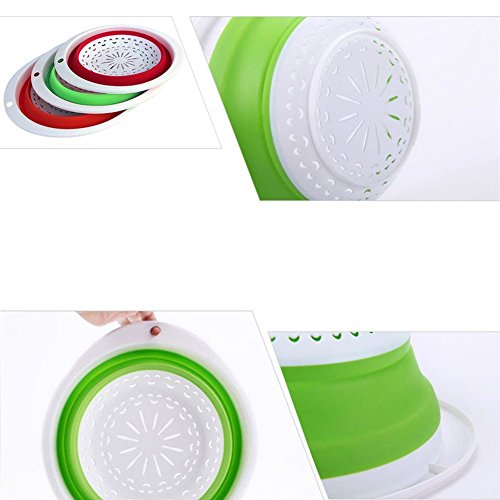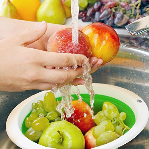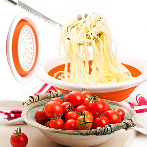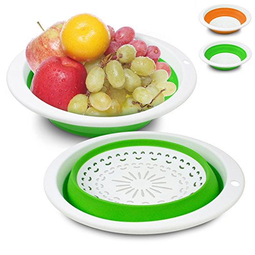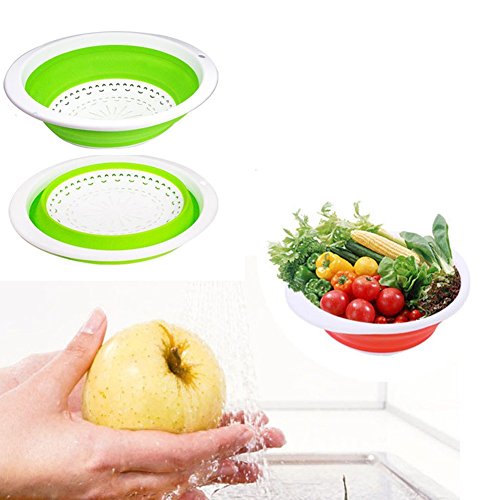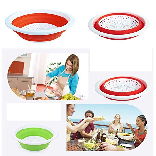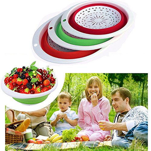 -. Feature : Set of 3, Blue,Green and Orange.The three included food strainers are 10.5 ,11.5 and 13 inches in diameter / Made of durable silicone and plastic / Non-toixc food grade flexible silicone is FDA approved / Ergonomic, space-saving design. Strainers are foldable, so they do not take up much needed room in your kitchen cupboards / Ideal for draining most foods like spaghetti, pasta, potatoes, broccoli, green beans, carrots, spinach and other veggies