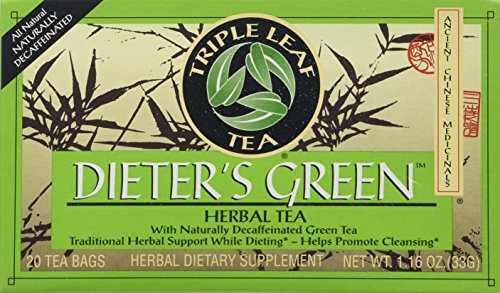 -. Binding : Grocery -. Brand : Triple Leaf Tea -. EAN : 0023991000101 -. Feature : Traditionally used in China to help promote cleansing and digestion / Antioxidants help promote healthy metabolism / Drink for herbal support while dieting / Natural decaffeinated / Herbal dietary supplement -. Label : Triple Leaf -. LegalDisclaimer : Actual product packaging and materials may contain more and different information than what is shown on our website. We recommend that you do not rely solely on the information presented and that you always read labels, warnings, and directions before using or consuming a product. Please see our full disclaimer below. -. Manufacturer : Triple Leaf -. Model : 764233 -. MPN : TRPLE LEAF-2348258 -. NumberOfItems : 6 -. PackageQuantity : 6 -. PartNumber : TRPLE LEAF-2348258 -. ProductGroup : Grocery -. ProductTypeName : GROCERY -. Publisher : Triple Leaf -. ReleaseDate : 2006-11-13 -. Size : 20 BAG -. Studio : Triple Leaf -. Title : Triple Leaf Tea, Tea Bags, Dieter's Green, 1.16 Ounce, 20 Count (Pack of 6) -. UPC : 023991000101