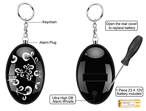 - Replaceable Batteries: This personal alarm keychain includes 1 Piece 23A 12V Button cell Batteries, if the alarm sound become weak or no sound means the battery is low or ran out,then you can replace it. please feel free to contact us, if you have any product question, thanks
