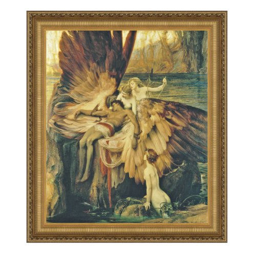 Mythology tells us Icarus escaped from Crete on wax and feather wings. They melted when he drew too close to the sun, he fell to his death and was washed ashore. Englishman Draper's 1889 work, his favorite, depicts the mourning of Icarus by a trio of beautiful sea nymphs. Our authentic stretched canvas replica captures the original painting's texture, depth of color, and even its subtle brushstrokes, which are applied by hand. Our replica European style, bright gold-toned, ribbed frame is cast in quality designer resin with an acanthus leaf and floret border that draws the eye toward this beautiful image. Grande: 36"Wx41"H.Feature