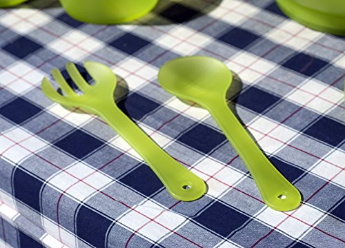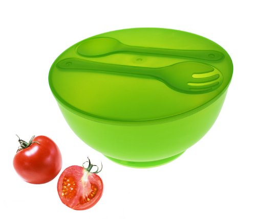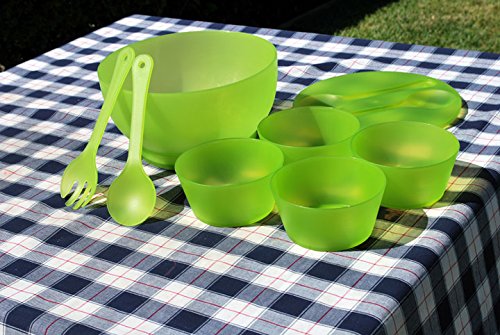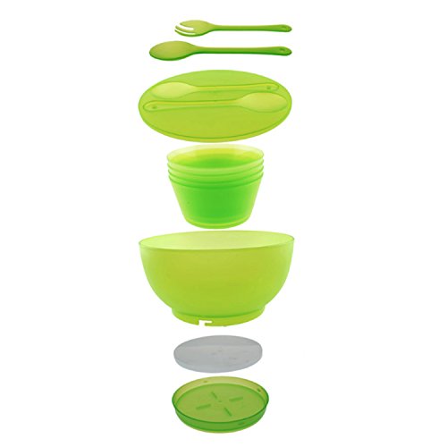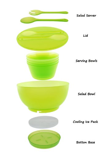 This chill salad bowl set is a great way to serve your salad at your next outdoor get together. A fresh green serving idea combines a cooling ice-pack base with lidded storage and transport and casual serving with the snap-in green servers that comes with 4 pcs serving bowls. Includes: 1-pc Salad Bowl with Lid 4 Bowls 2 Serving pieces 1 Removable Ice Pack This unique chill salad bowl set makes a practical, yet thoughtful gifts for holidays, birthdays, anniversaries, Mother's Day or housewarmings. Dimensions: 10" dia x 5" h Material: Polypropylene Care and Clean: Removable Ice Pack is Hand Washable. Bowl is top rack dishwasher safeFeature