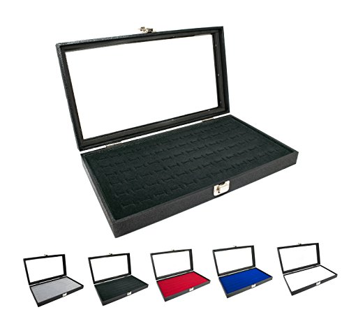 - Feature : Stylish and sleek with a real glass top panel / The 72-ring foam pads are topped with plush felt and are available in 5 colors ? Red, Black, Blue, Gray and White. / Metal latch on the lid allows you to display your jewelry in a dust free and secure environment. / Great for travel, displaying jewelry collections to customers and showing samples. / Novel Box drawstring pouch included