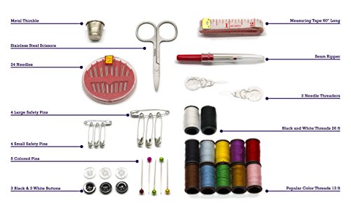 - EVERYTHING YOU NEED IN ONE COMPACT KIT - Stainless steel scissors, measuring tape, 12 colored threads with extra-long black and white, 24 needles, 8 small & large safety pins, 6 black & white buttons, 2 needle threaders, 5 color pins, seam ripper and thimble