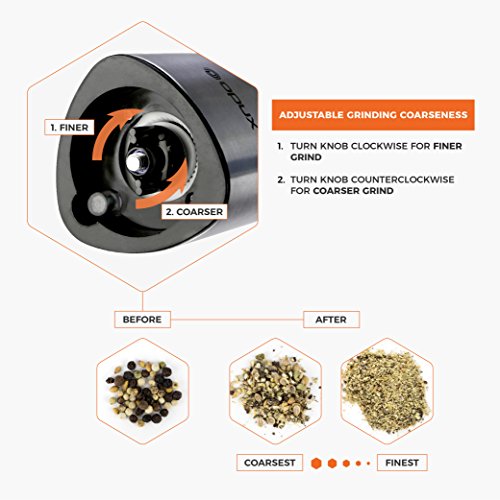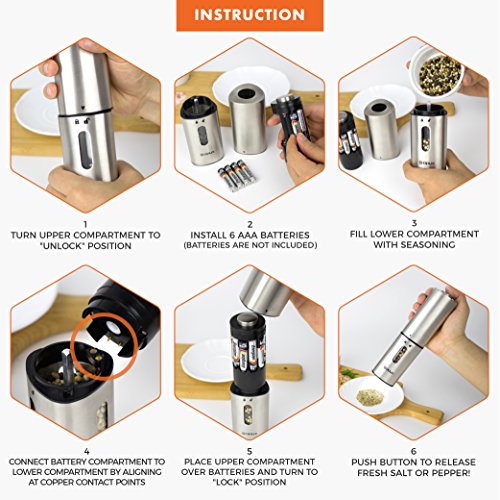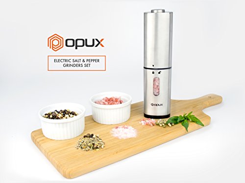 Studio : OPUX Publisher : OPUX Product Description Deluxe Electric Salt Pepper Grinder Set With LED Light by OPUX ? This Deluxe Electric Salt and Pepper Grinder set by OPUX is ideal for cooking in the kitchen or grilling outside in the backyard! ? With its automatic one touch operation, the Salt and Pepper Grinder Set is simple to use and practical. With its ability to adjust spice coarseness and LED light, it will enhance your cooking experience with better accuracy and ease. ? An instruction manual is included with this electric Salt and Pepper Grinder Set by OPUX. ? This Electric Salt and Pepper grinder set by OPUX requires 6 AAA batteries (not included). ? Our Deluxe Electric Salt and Pepper Grinders measure at 8" tall, 2" wide. OPUX creates quality products for your many lifestyles. Our Vision To provide premium kitchen and wine products that greatly simplifies your life. We will continue to innovate and bring exciting products to market so you can achieve more in life! Our Products At OPUX, we offer an extensive line of kitchen tools (such as salt pepper mills), lunch bags, and wine bags/accessories made of highest quality for all occasions. Our products are meticulously designed with materials and functions that truly simplify your life so you can focus on creating your favorite meals or entertaining your guests. 0
