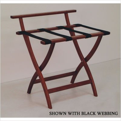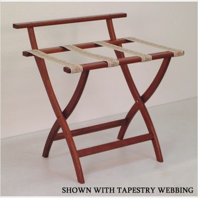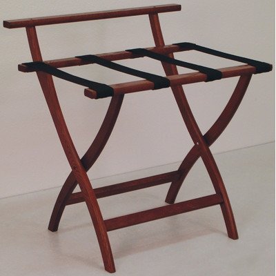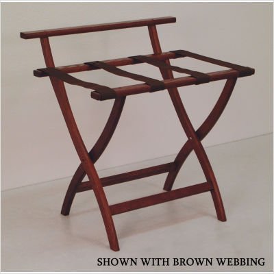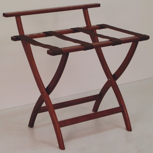 Studio : Wooden Mallet Publisher : Wooden Mallet Binding : Misc. Product Description Wooden Mallet's Wall Saver oak luggage rack will give your guest room the feeling of a four star hotel. Our unique "Wall Saver" feature prevents costly wall damage. Graceful, curved legs add a designer flair. Take it out for guests and then fold it up for easy storage. It is also great in the master bedroom for packing suitcases for business trips or vacations. Rack is built using solid oak construction and state-of-the-art finish for heavy use and lasting beauty. Four, two-Inch woven straps support heavy suitcases and come in your choice of tapestry, black, brown or tan. This unit is available in three designer finish colors to coordinate with any decor, light oak, medium oak or mahogany. Rack has multiple uses when it doubles as a breakfast tray holder or blanket stand. 0