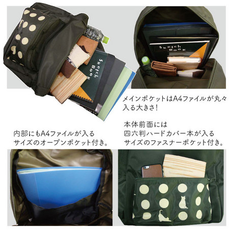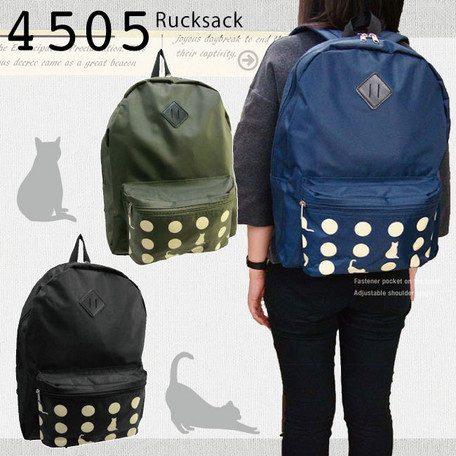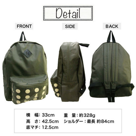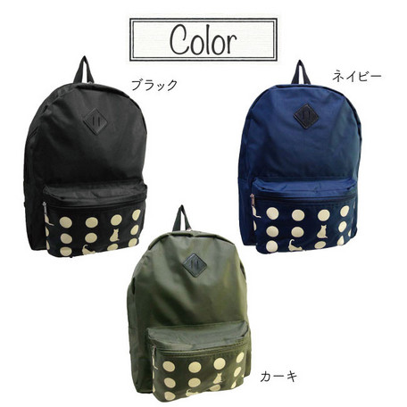出ポケットのドットプリントがかわいいリュックサックです。