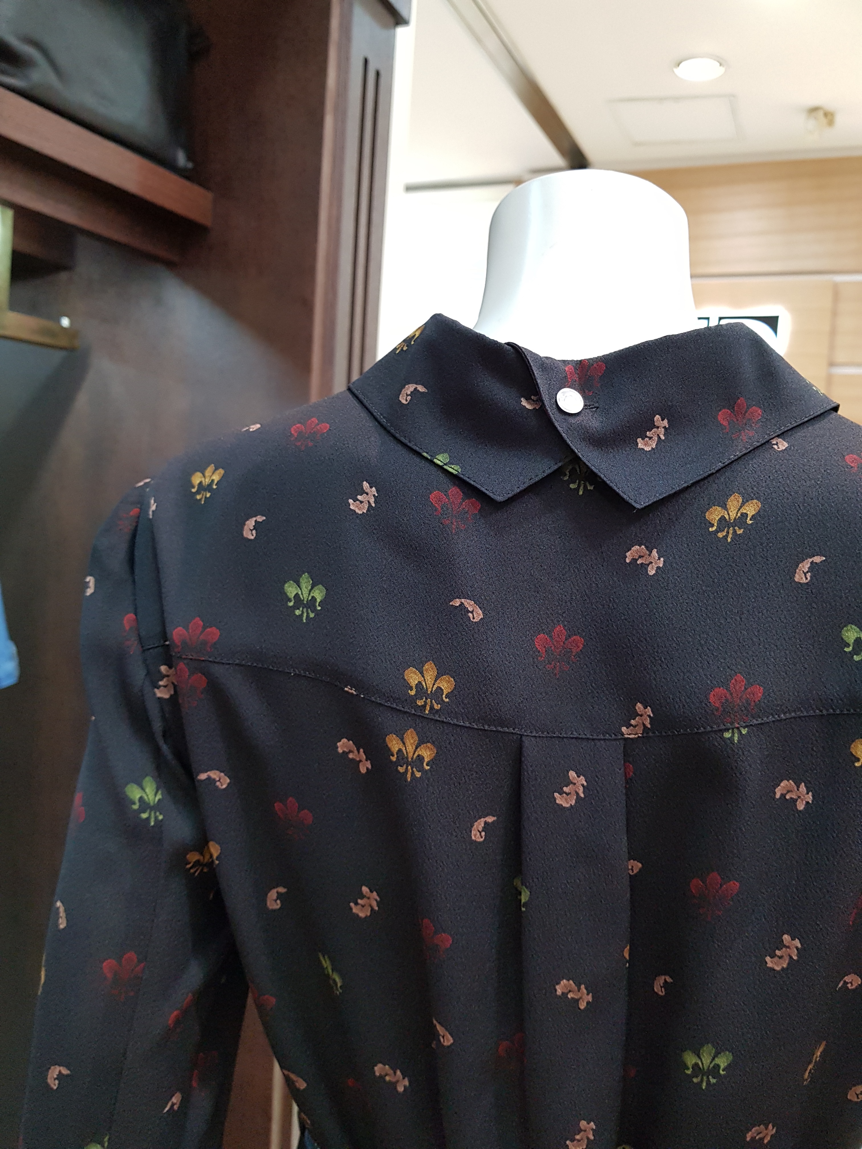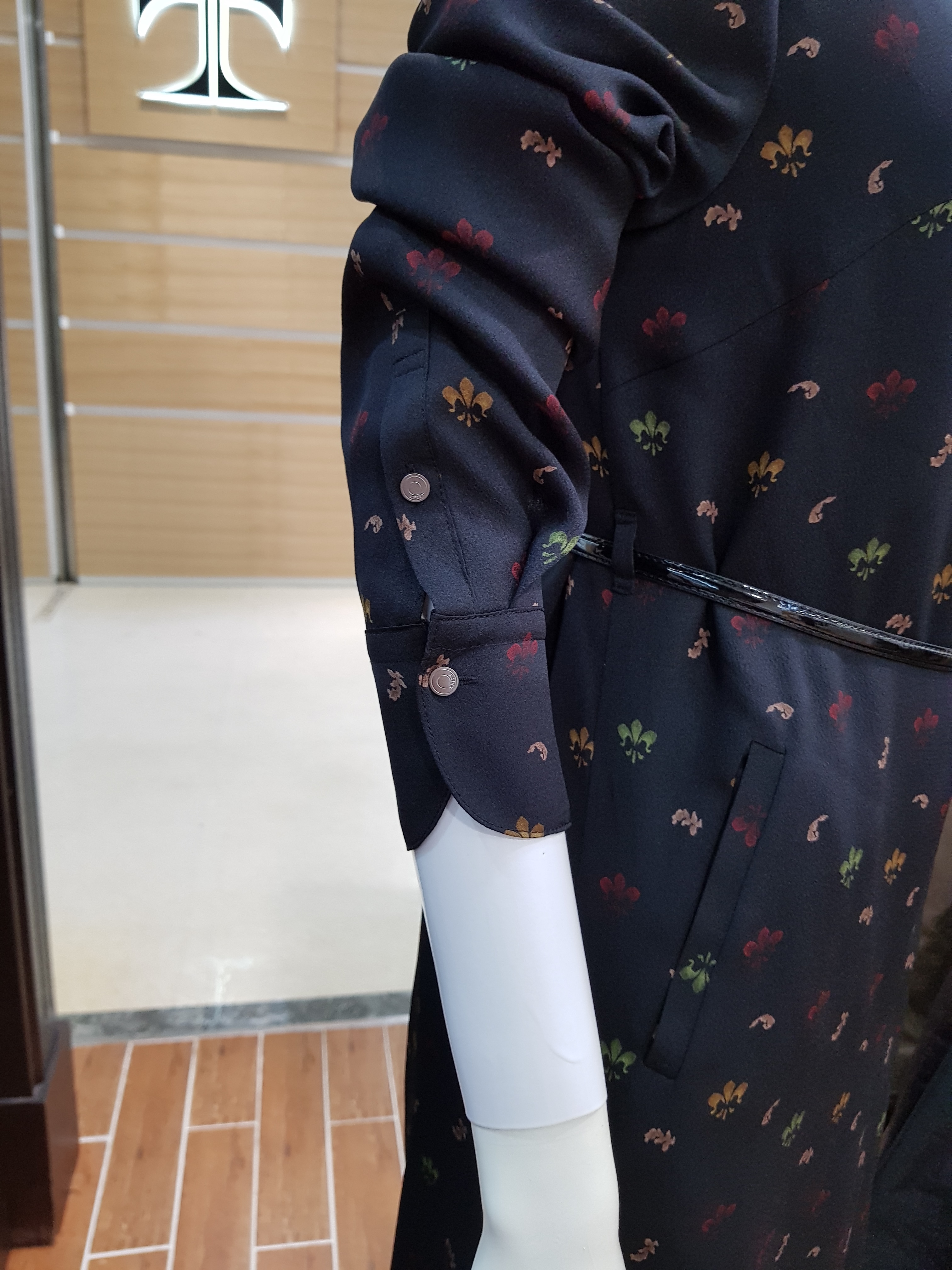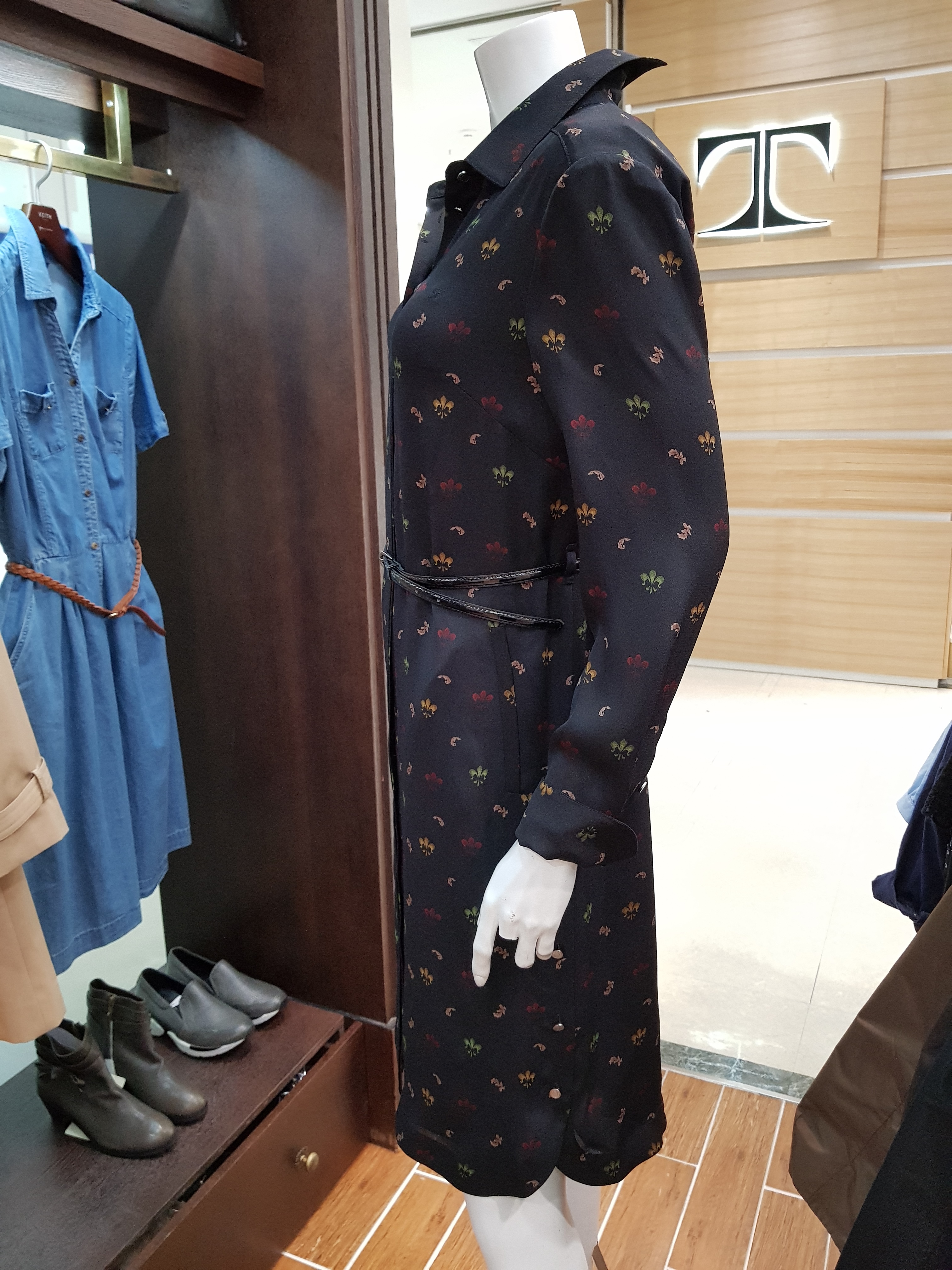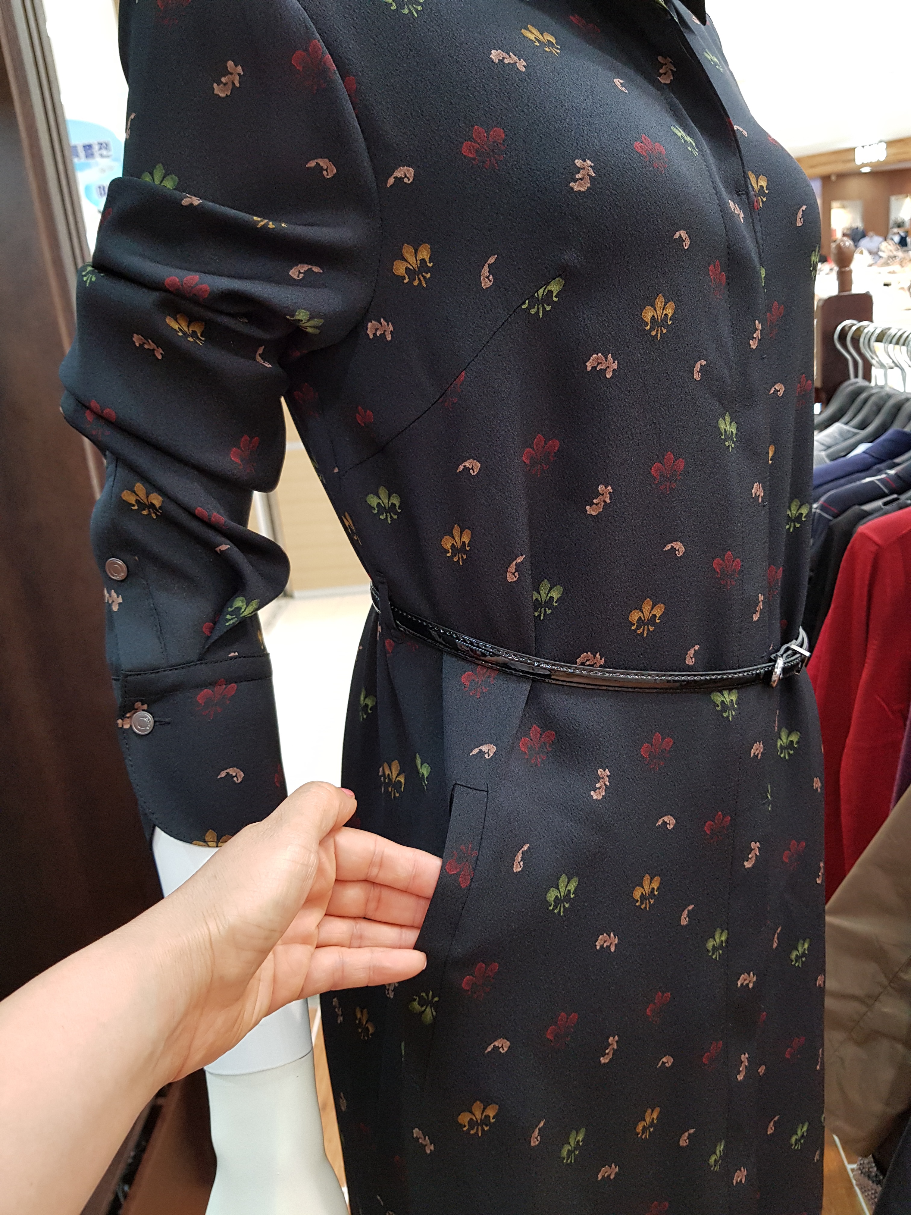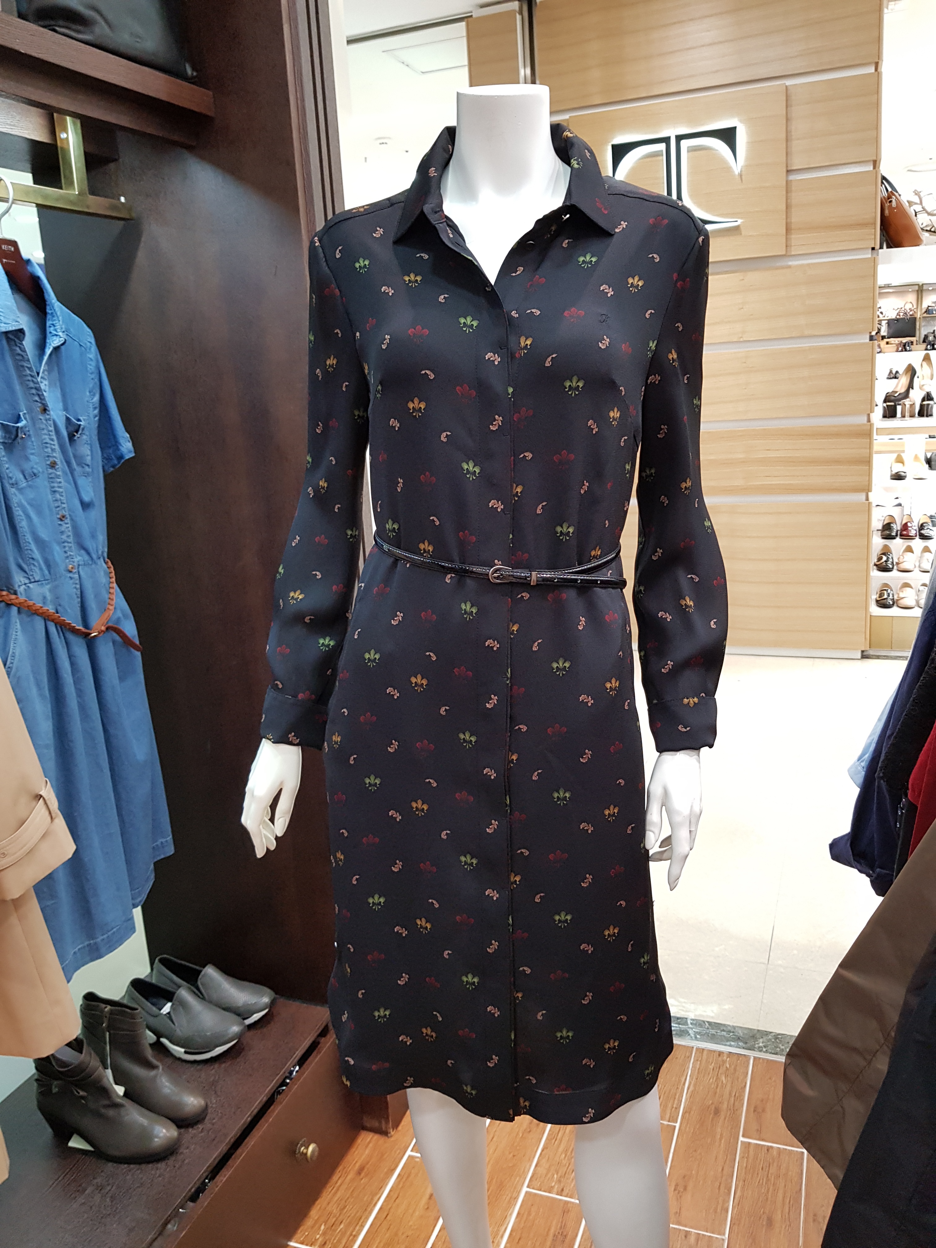 키이스~잔잔한 꽃프린트가 포인트로 단정하고 고급스런 느낌의 원피스입니다 스탠카라의 단아함과 여유있는 라인으로 가을트랜치코트속이나 재킷에 잘어울리는 아이템입니다 총장96센티입니다