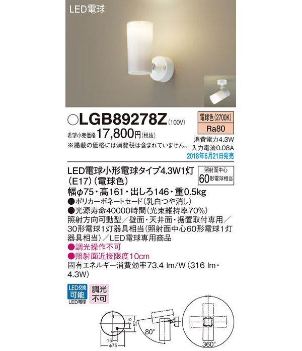 ●光源:LED電球小形電球タイプ4.3W1灯(E17)(電球色)、色温度:2700K、光源寿命40000時間(光束維持率70%)