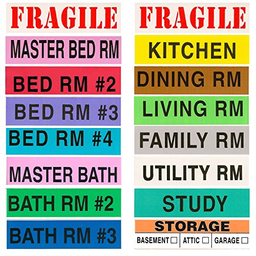 Over 35 Years Associated with the Moving Industry. Your 800 Moving Label kit includes: 50 of each Master Bedroom; Bedroom-2; Bedroom-3; Bedroom- 4; Master Bath; Bathroom-2; Bathroom-3; Living Room; Dining Room; Storage; Kitchen; Family Room; Study; Utility Room; and 100 Fragile Permanent Adhesive Moving Labels approximately 4” x 1”. NOT RECOMMENDED FOR USE ON FURNITURE.