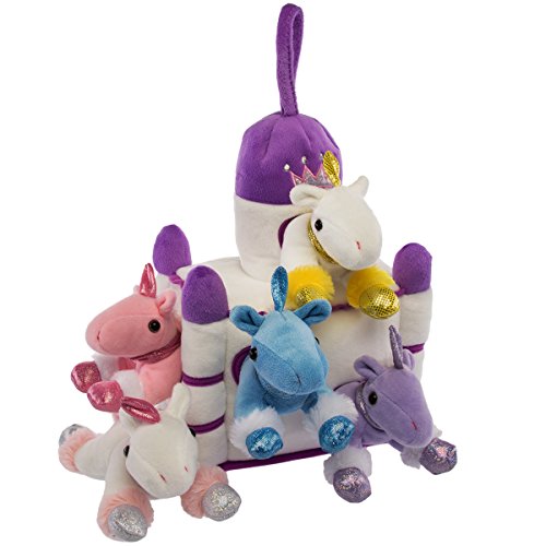 -. Title : Plush Playhouse Toy Set & 5 Stuffed Animals Soft Gifts For Kids, Puppy, Unicorn Pony Castle, Forest Treehouse Playhosue