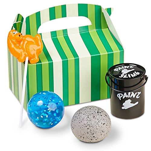 Includes (1) empty favor box, (1) splat rock, (1) barrel of slime, (1) bounce ball, (1) lollipop, and (1) small assorted dinosaur toy.