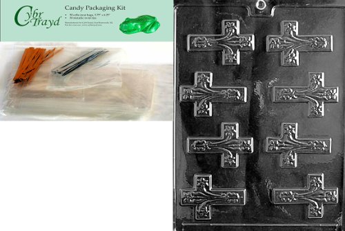 Cybrtrayd Fancy Crosses Chocolate Candy Mold with Chocolate Packaging Bundle, Includes 50 Cello Bags, 50 Gold/Silver Twist Ties and Exclusive Cybrtrayd Copyrighted Chocolate Molding Instructions